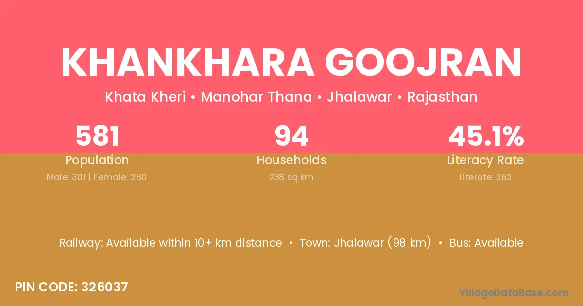 Jhalawar (98 km) is the nearest town to Khankhara Goojran village for major economic activities and is located approximately 98 km away.