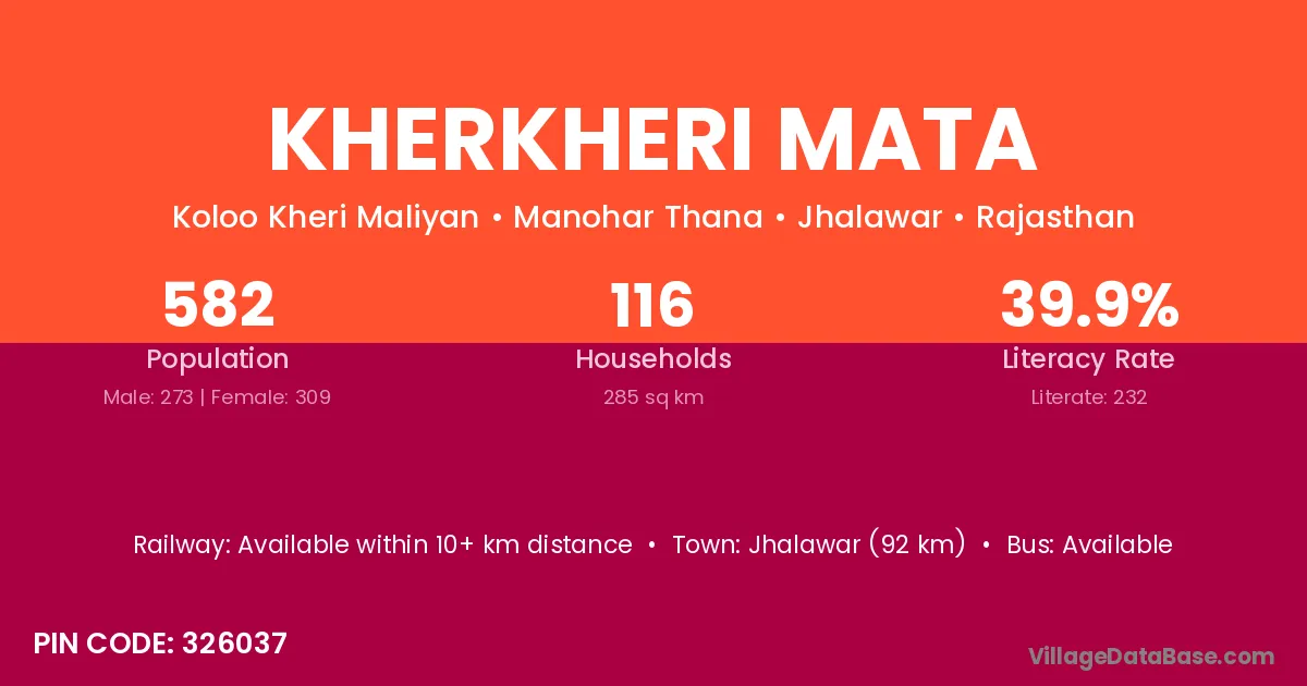 Jhalawar (92 km) is the nearest town to Kherkheri Mata village for major economic activities and is located approximately 92 km away.
