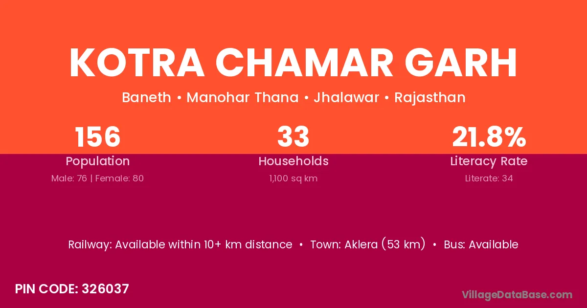 Aklera (53 km) is the nearest town to Kotra Chamar Garh village for major economic activities and is located approximately 53 km away.