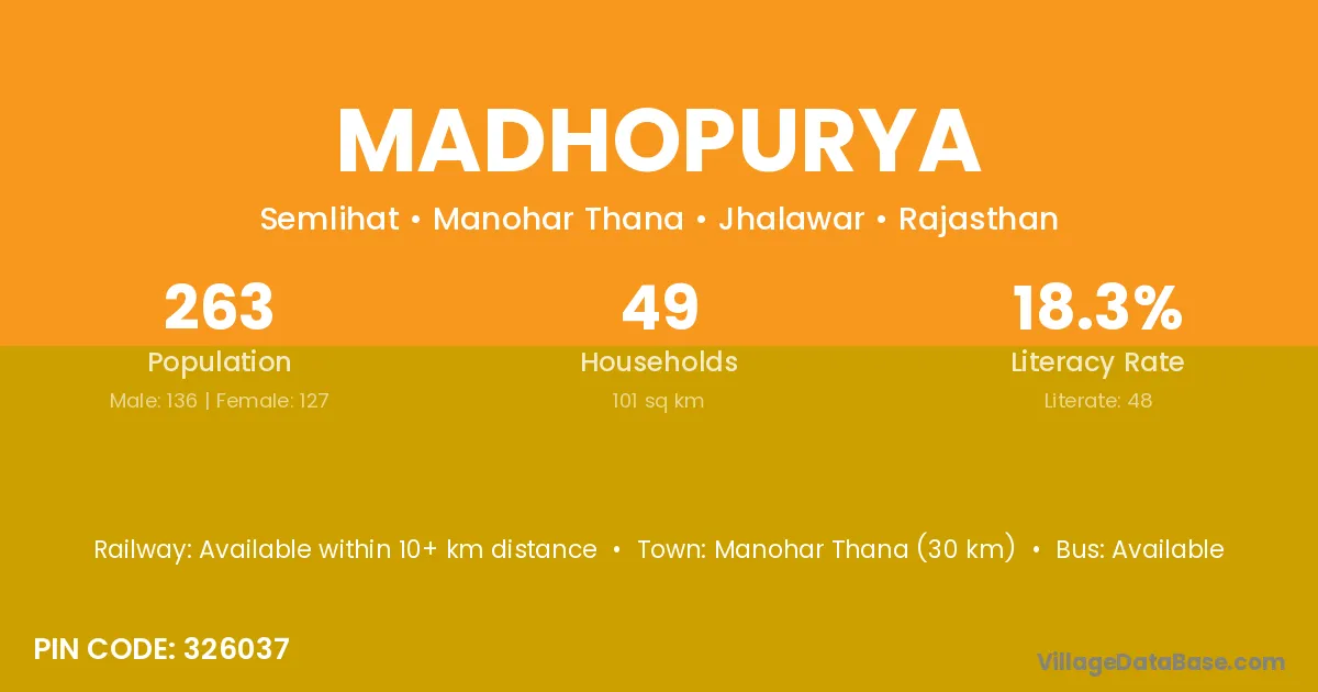 Manohar Thana (30 km) is the nearest town to Madhopurya village for major economic activities and is located approximately 30 km away.