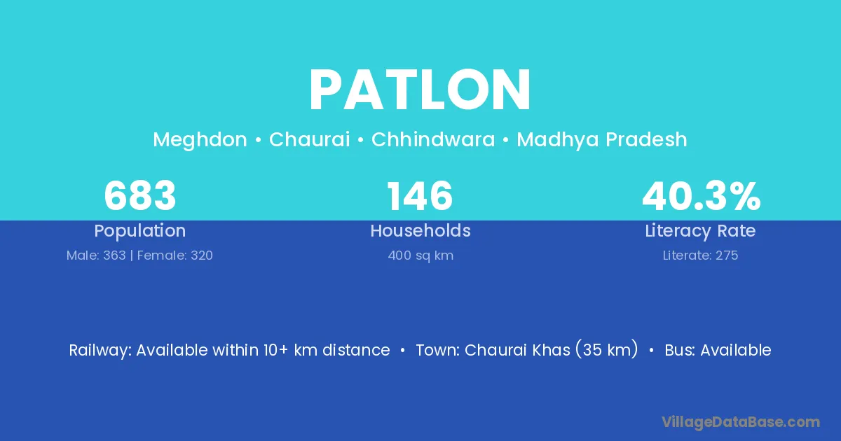 The literacy rate of Patlon village is 41.60%. Male literacy stands at 58.97% and female literacy at 24.40%.