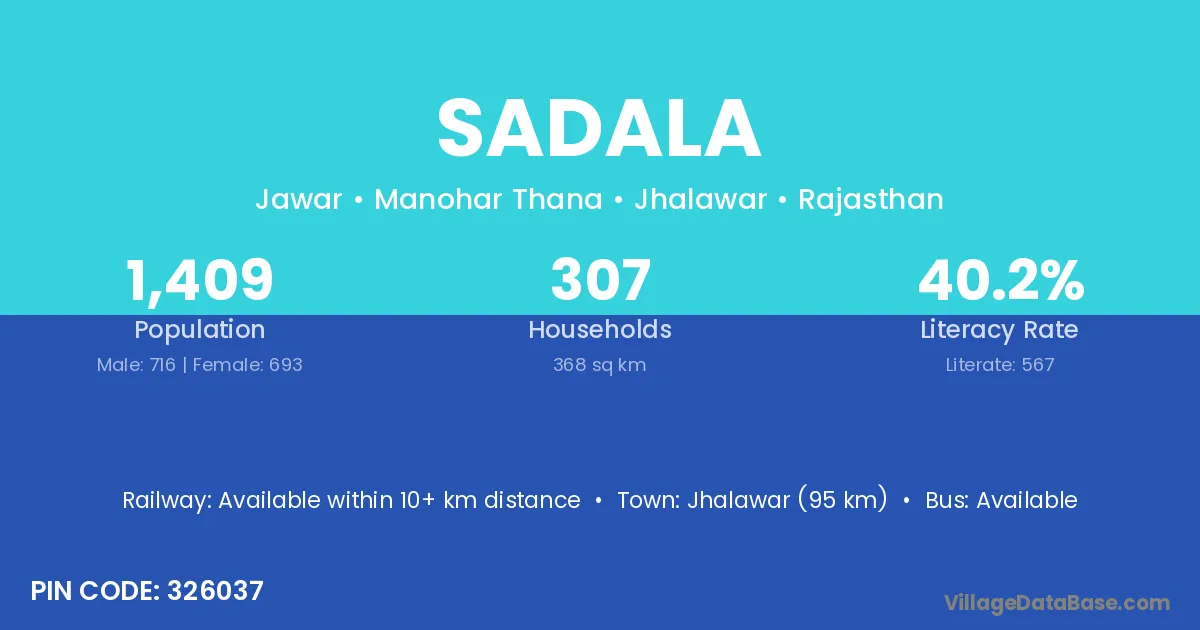 Jhalawar (95 km) is the nearest town to Sadala village for major economic activities and is located approximately 95 km away.