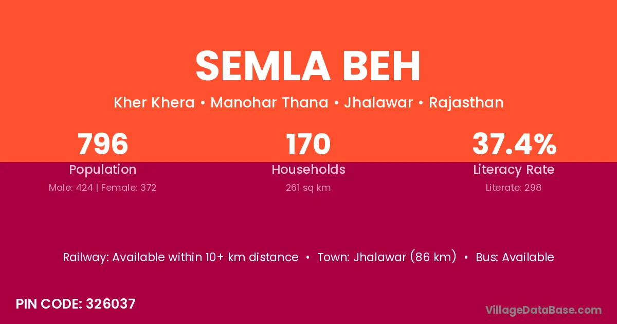 Jhalawar (86 km) is the nearest town to Semla Beh village for major economic activities and is located approximately 86 km away.