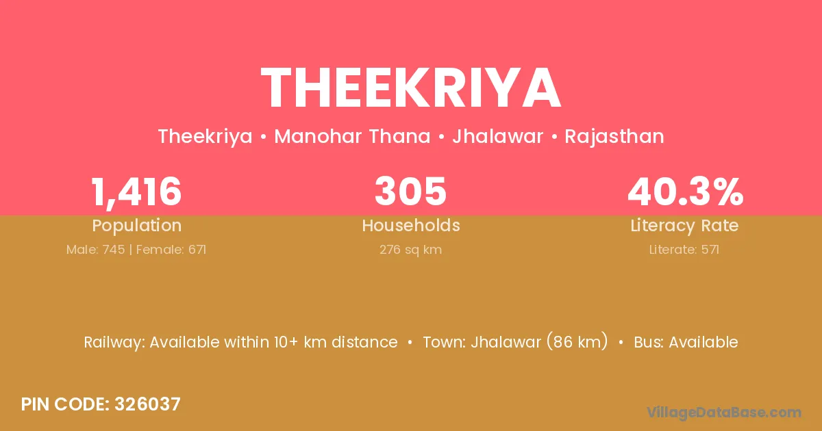 Jhalawar (86 km) is the nearest town to Theekriya village for major economic activities and is located approximately 86 km away.