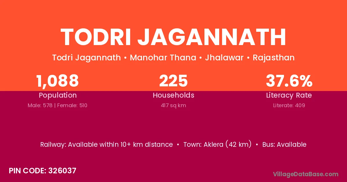 Aklera (42 km) is the nearest town to Todri Jagannath village for major economic activities and is located approximately 42 km away.