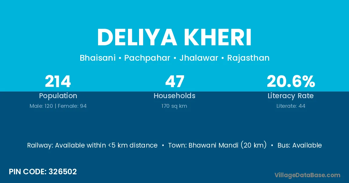 Bhawani Mandi (20 km) is the nearest town to Deliya Kheri village for major economic activities and is located approximately 20 km away.
