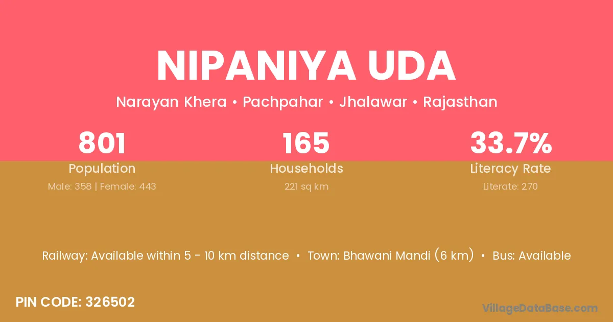 Bhawani Mandi (6 km) is the nearest town to Nipaniya Uda village for major economic activities and is located approximately 6 km away.