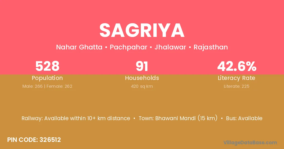 Bhawani Mandi (15 km) is the nearest town to Sagriya village for major economic activities and is located approximately 15 km away.