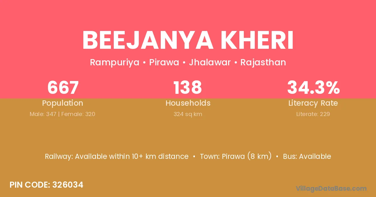 Pirawa (8 km) is the nearest town to Beejanya Kheri village for major economic activities and is located approximately 8 km away.