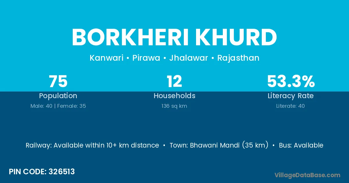 Bhawani Mandi (35 km) is the nearest town to Borkheri Khurd village for major economic activities and is located approximately 35 km away.