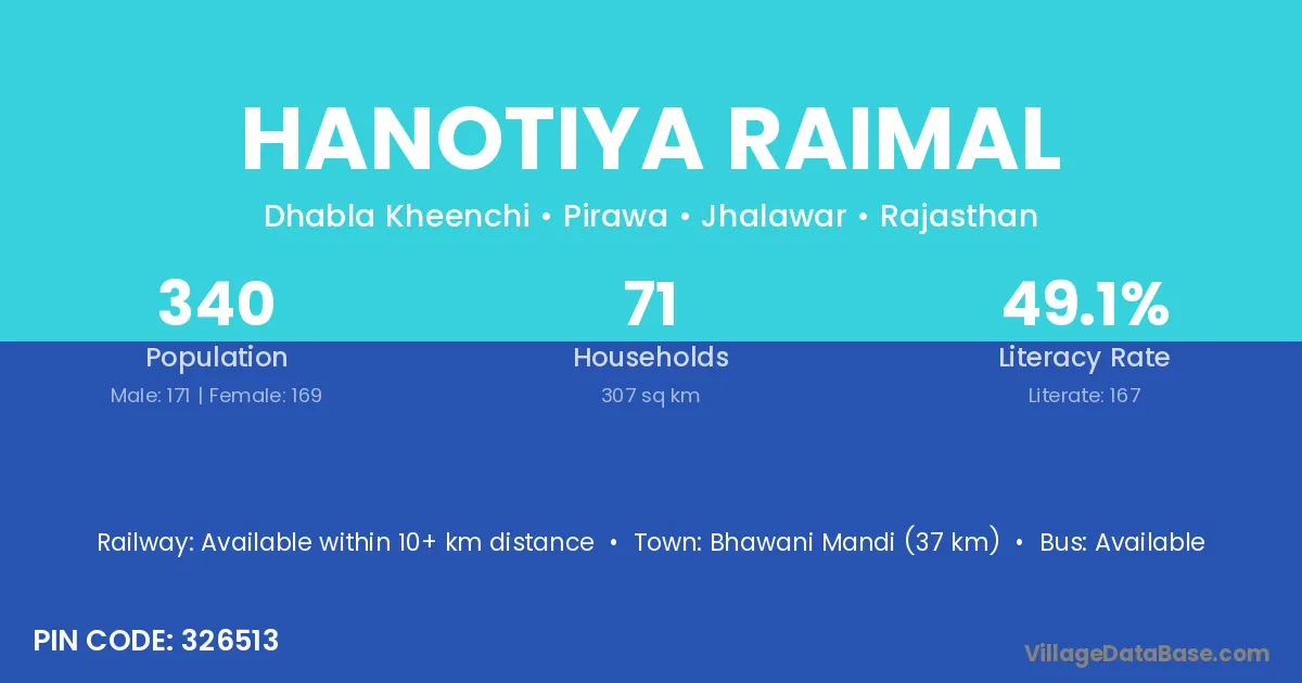 Bhawani Mandi (37 km) is the nearest town to Hanotiya Raimal village for major economic activities and is located approximately 37 km away.