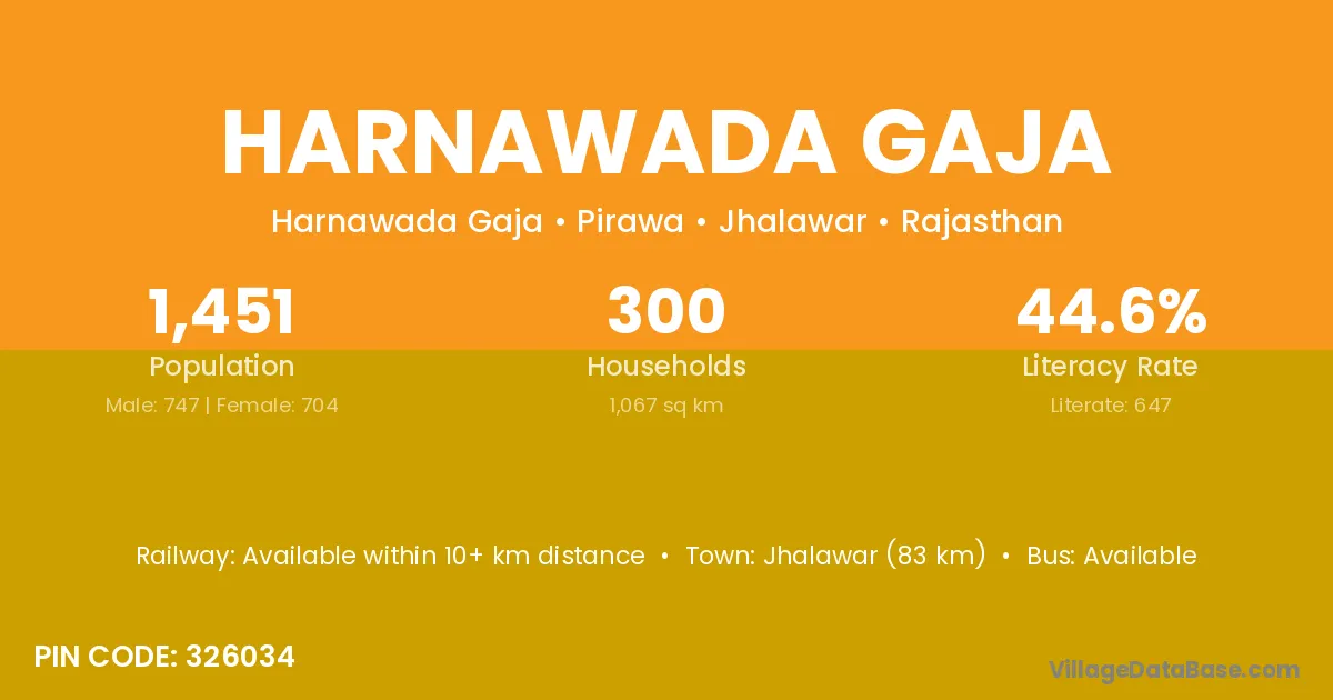 Jhalawar (83 km) is the nearest town to Harnawada Gaja village for major economic activities and is located approximately 83 km away.