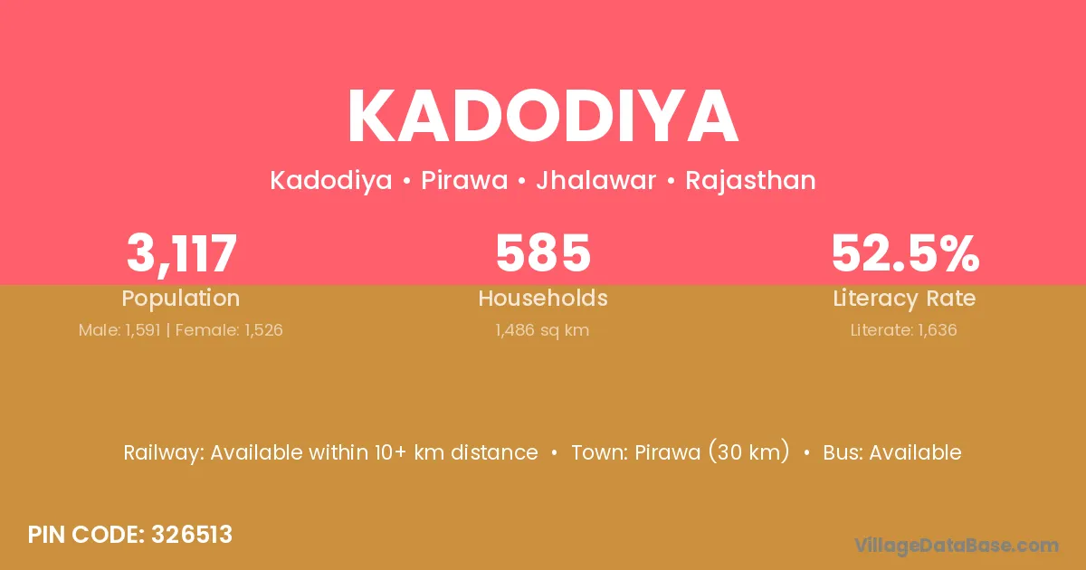 Pirawa (30 km) is the nearest town to Kadodiya village for major economic activities and is located approximately 30 km away.