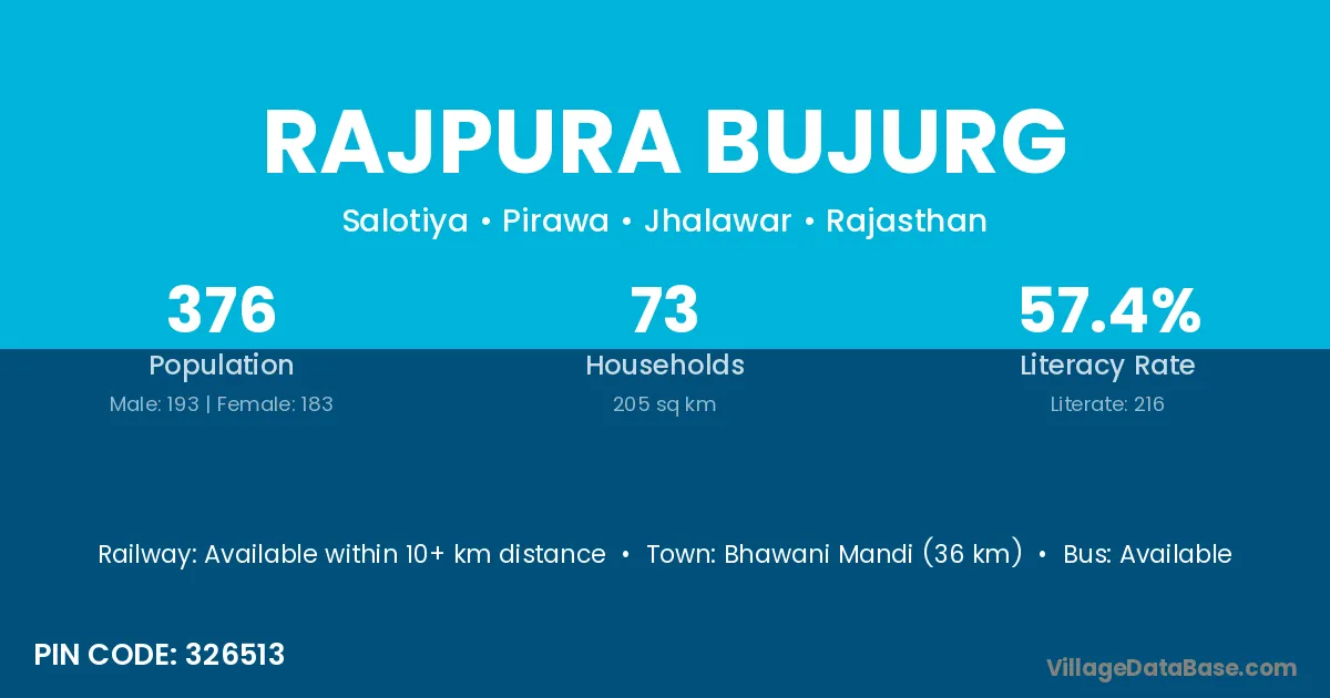 Bhawani Mandi (36 km) is the nearest town to Rajpura Bujurg village for major economic activities and is located approximately 36 km away.