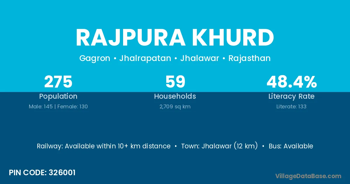 Jhalawar (26 km) is the nearest town to Rajpura Khurd village for major economic activities and is located approximately 26 km away.
