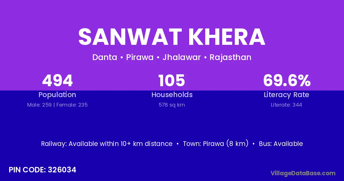 Pirawa (8 km) is the nearest town to Sanwat Khera village for major economic activities and is located approximately 8 km away.