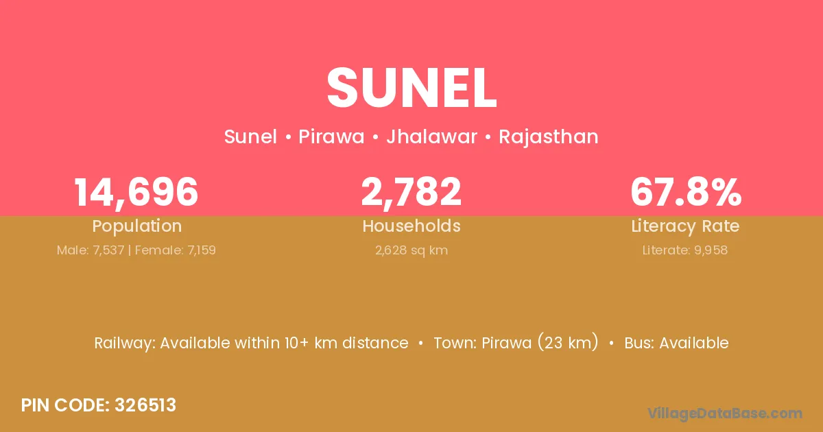 Pirawa (23 km) is the nearest town to Sunel village for major economic activities and is located approximately 23 km away.