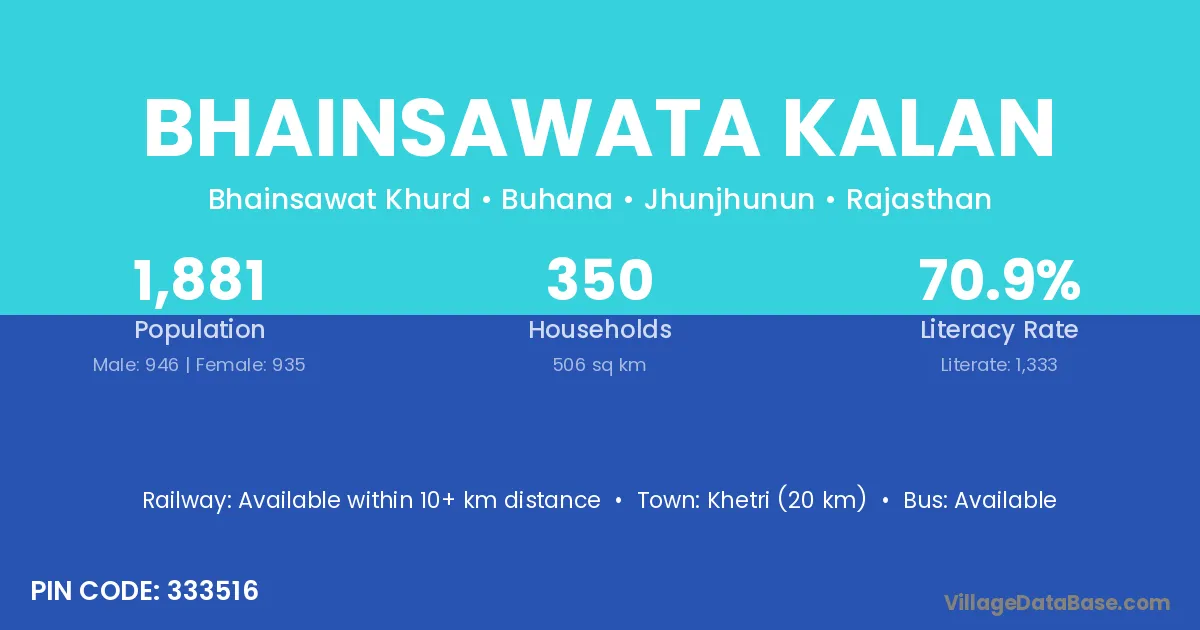 Khetri (20 km) is the nearest town to Bhainsawata Kalan village for major economic activities and is located approximately 20 km away.