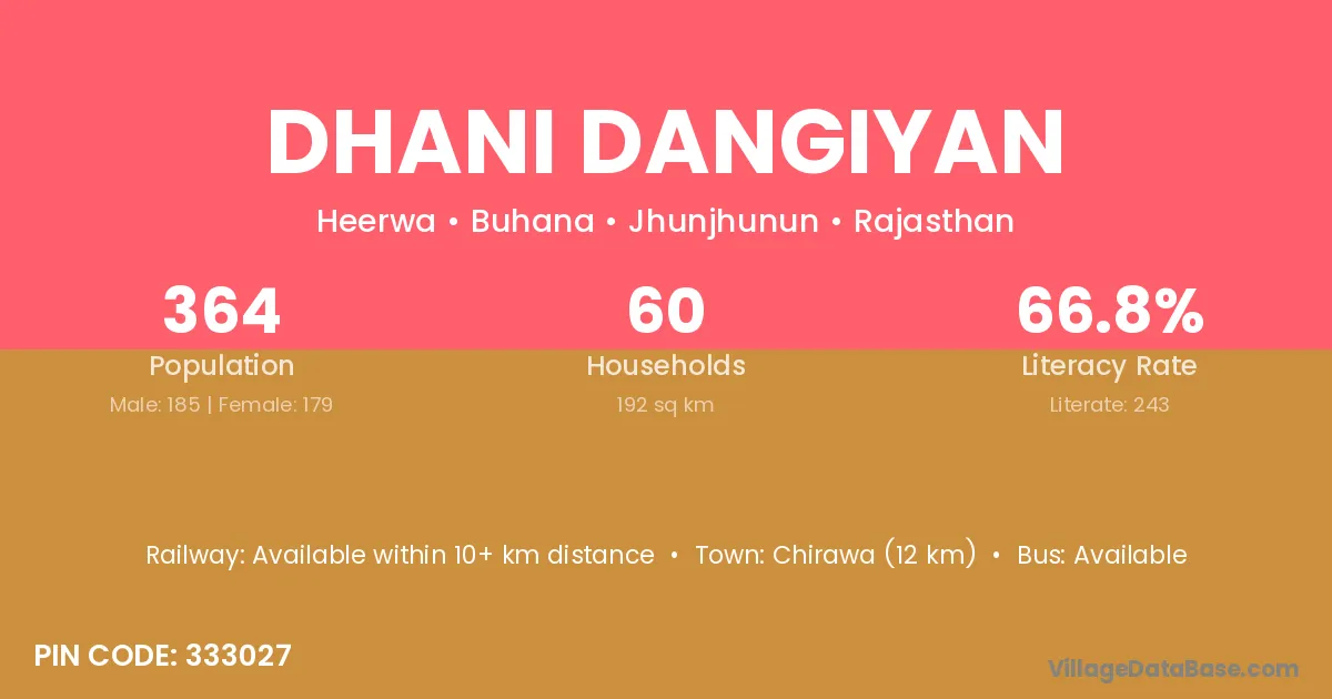 Chirawa (12 km) is the nearest town to Dhani Dangiyan village for major economic activities and is located approximately 12 km away.