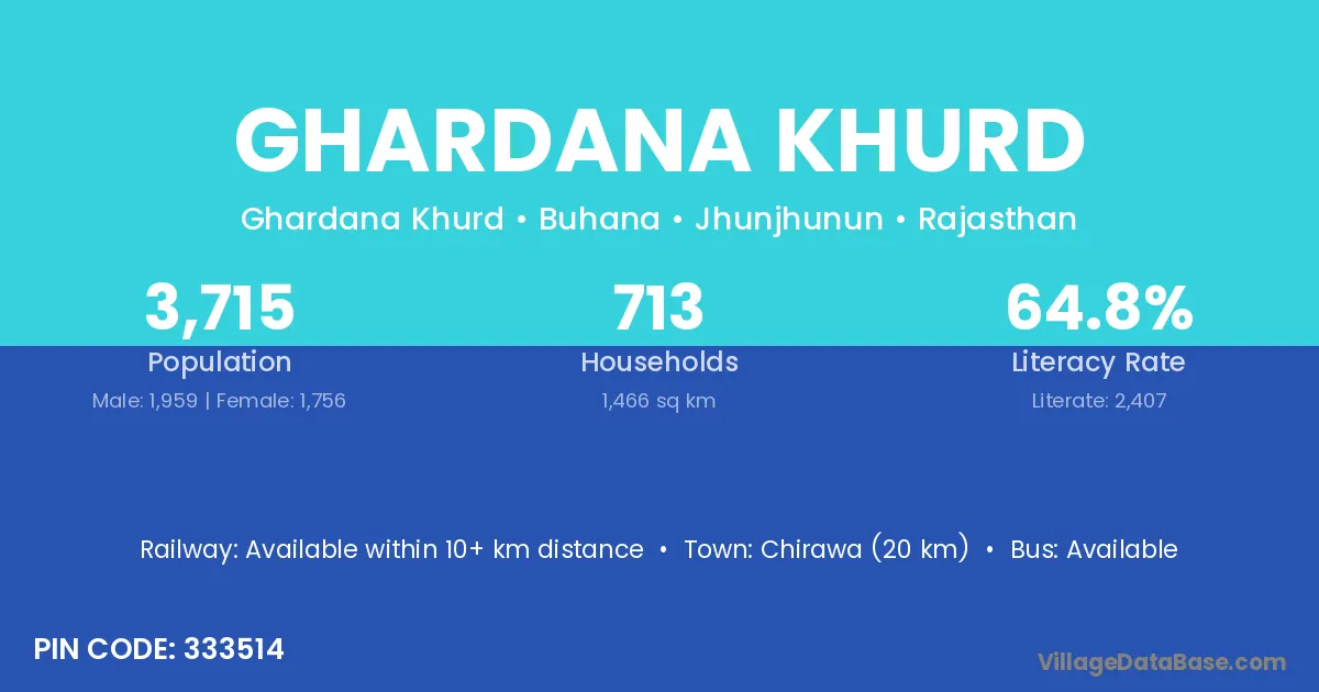 Chirawa (20 km) is the nearest town to Ghardana Khurd village for major economic activities and is located approximately 20 km away.