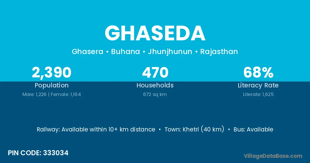 Khetri (40 km) is the nearest town to Ghaseda village for major economic activities and is located approximately 40 km away.