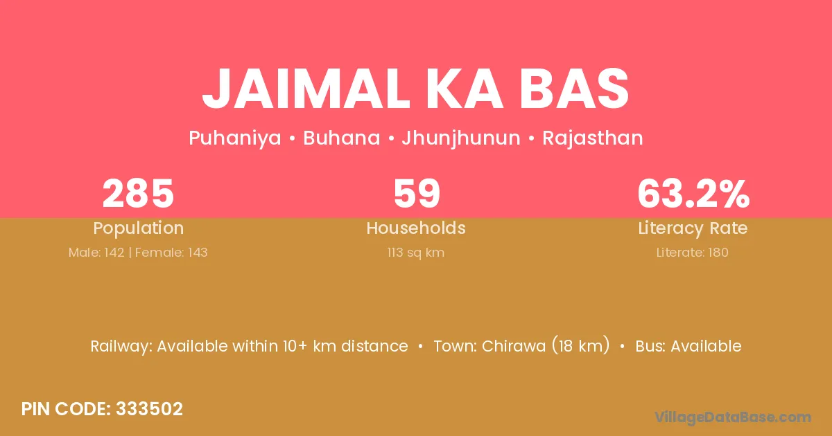 Jaimal Ka Bas village has a total population of 285 people, of which 142 are males and 143 are females.