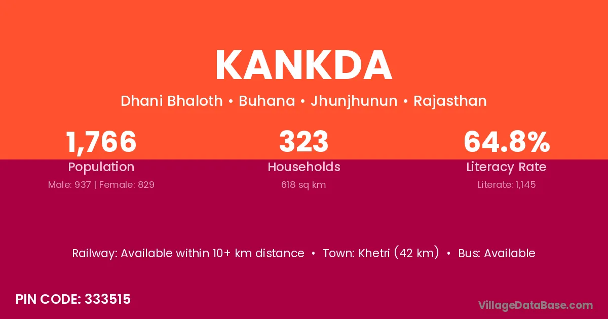 Khetri (42 km) is the nearest town to Kankda village for major economic activities and is located approximately 42 km away.