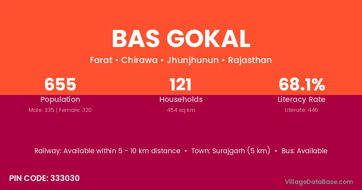 Surajgarh (5 km) is the nearest town to Bas Gokal village for major economic activities and is located approximately 5 km away.