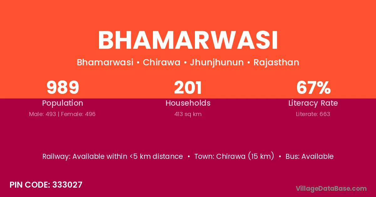 Chirawa (15 km) is the nearest town to Bhamarwasi village for major economic activities and is located approximately 15 km away.