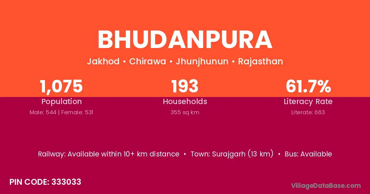 Surajgarh (13 km) is the nearest town to Bhudanpura village for major economic activities and is located approximately 13 km away.