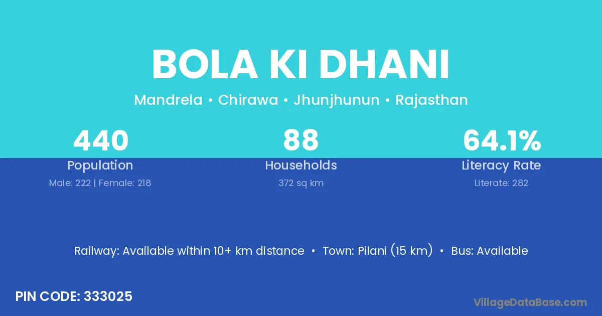 Bola Ki Dhani village has a total population of 440 people, of which 222 are males and 218 are females.