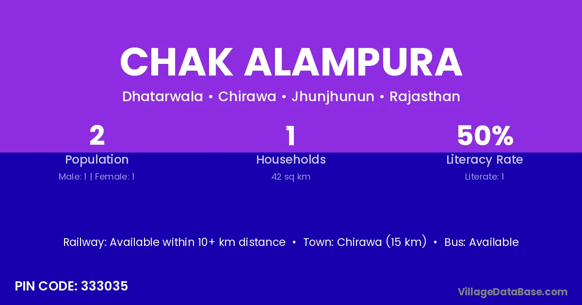 Chirawa (15 km) is the nearest town to Chak Alampura village for major economic activities and is located approximately 15 km away.