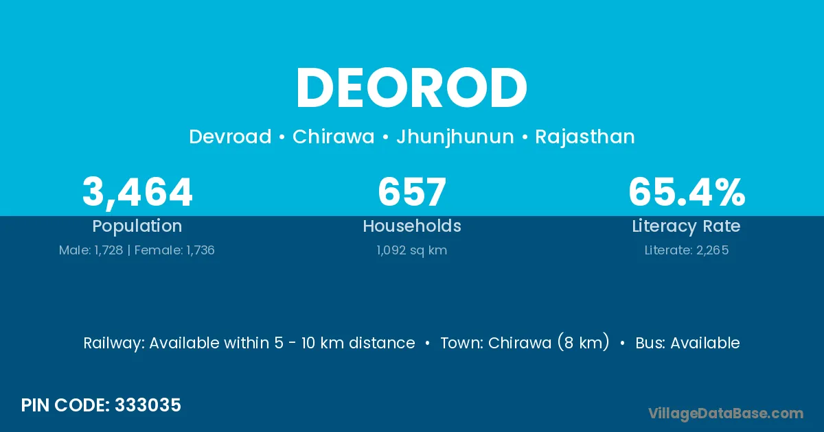 Chirawa (8 km) is the nearest town to Deorod village for major economic activities and is located approximately 8 km away.