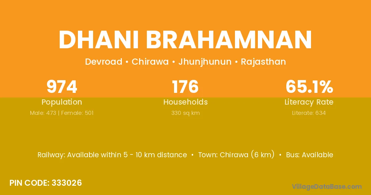 Chirawa (6 km) is the nearest town to Dhani Brahamnan village for major economic activities and is located approximately 6 km away.