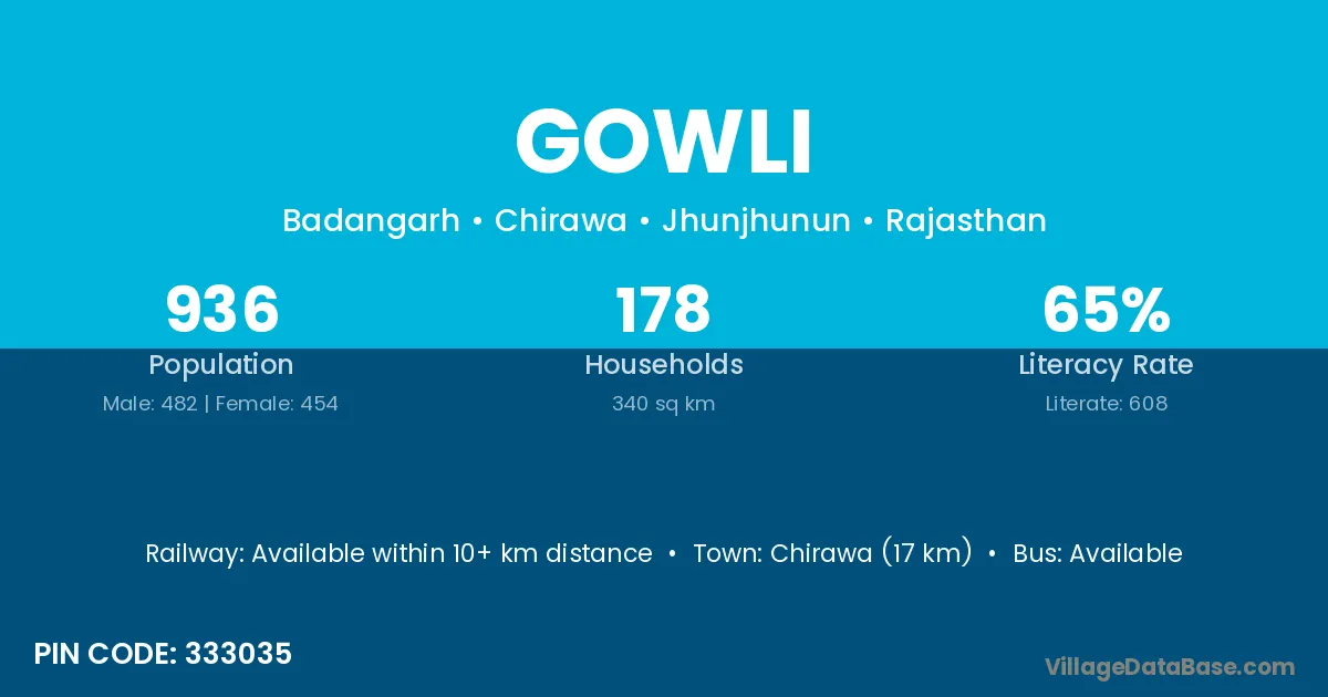 Chirawa (17 km) is the nearest town to Gowli village for major economic activities and is located approximately 17 km away.