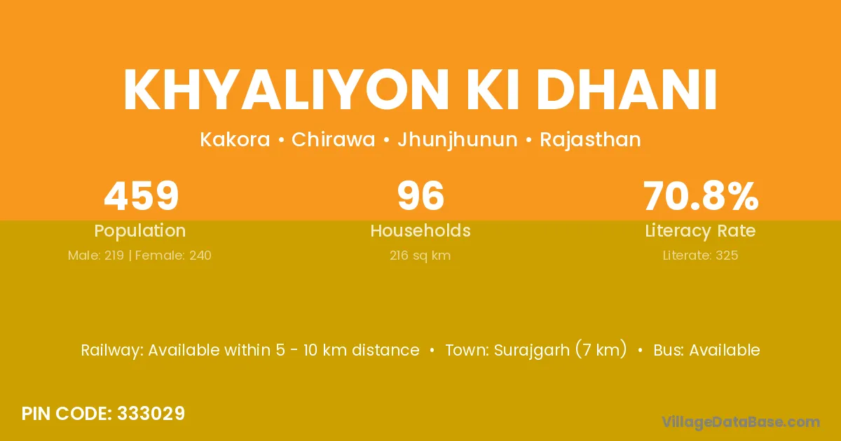 Khyaliyon Ki Dhani village has a total population of 459 people, of which 219 are males and 240 are females.