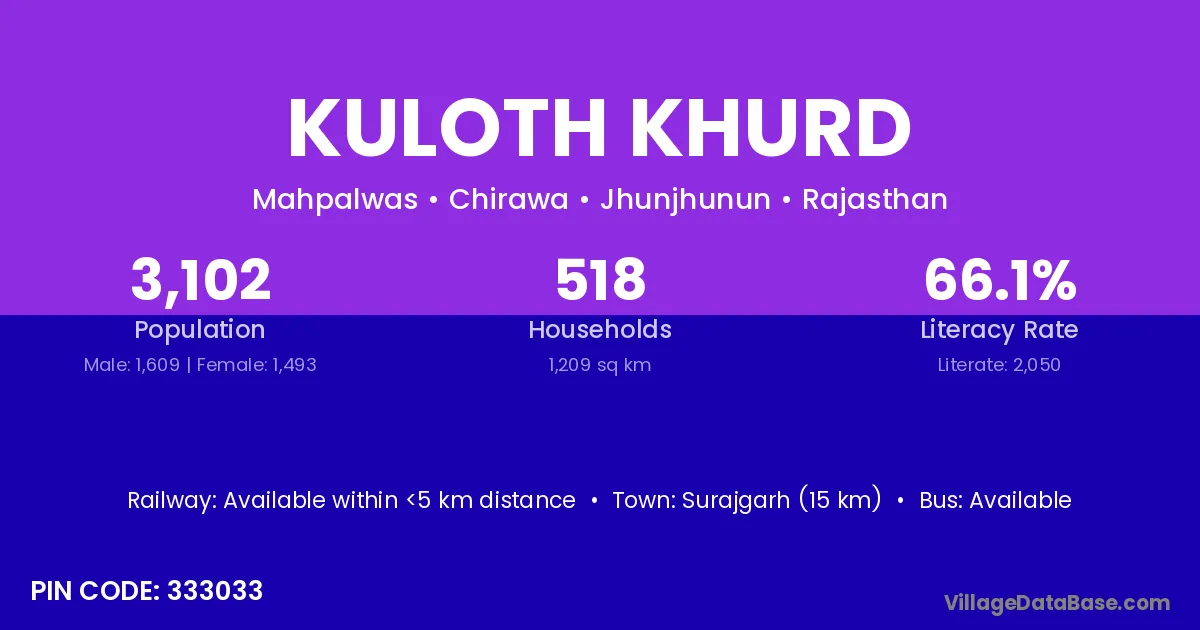 Surajgarh (15 km) is the nearest town to Kuloth Khurd village for major economic activities and is located approximately 15 km away.