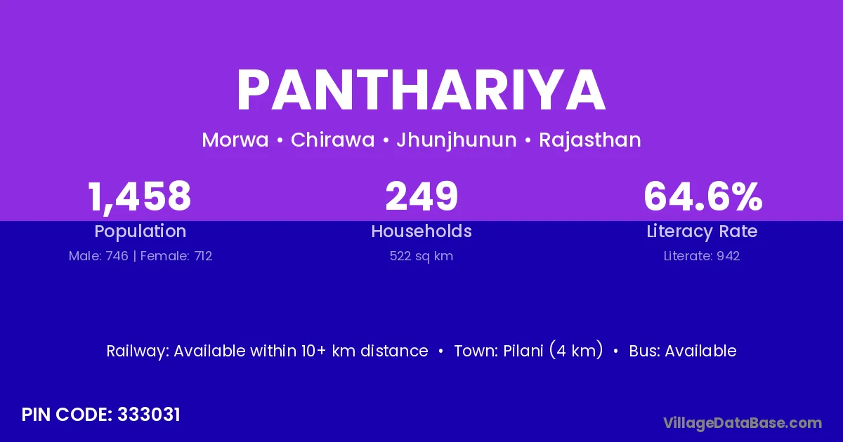 Pilani (4 km) is the nearest town to Panthariya village for major economic activities and is located approximately 4 km away.