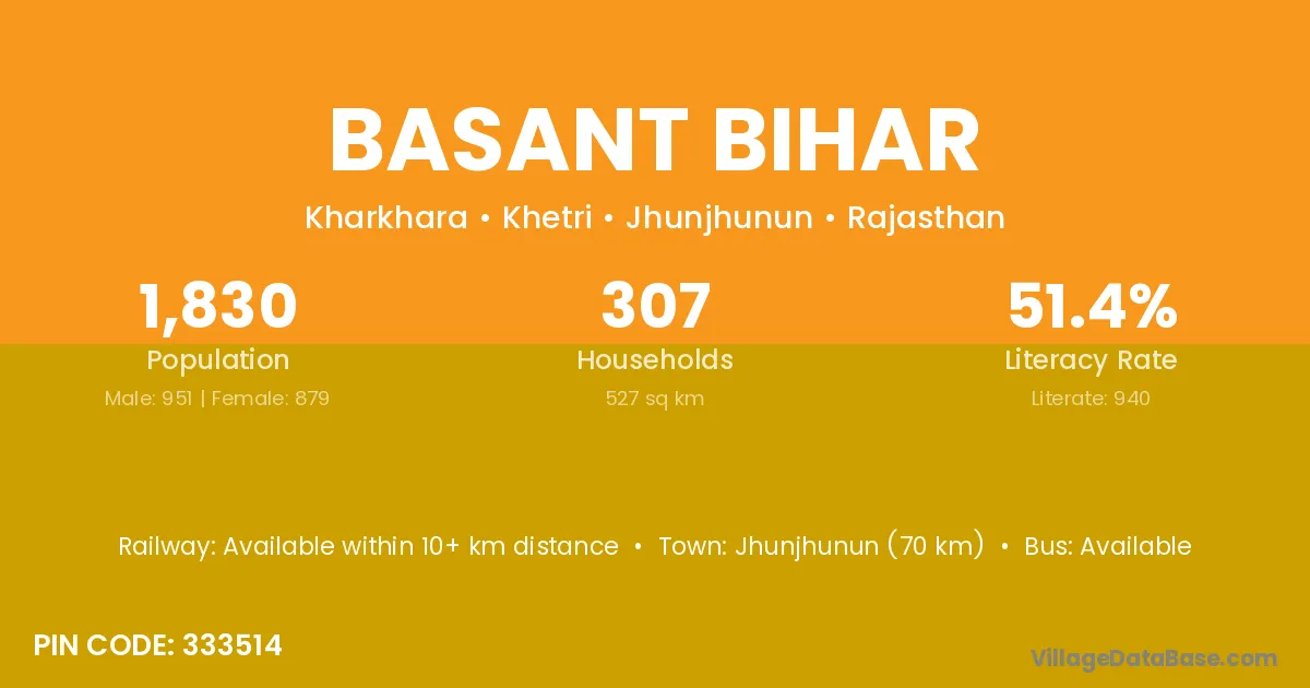 Jhunjhunun (70 km) is the nearest town to Basant Bihar village for major economic activities and is located approximately 70 km away.