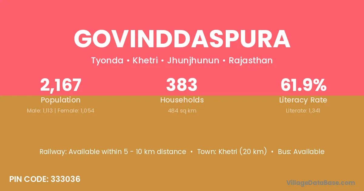 Khetri (20 km) is the nearest town to Govinddaspura village for major economic activities and is located approximately 20 km away.