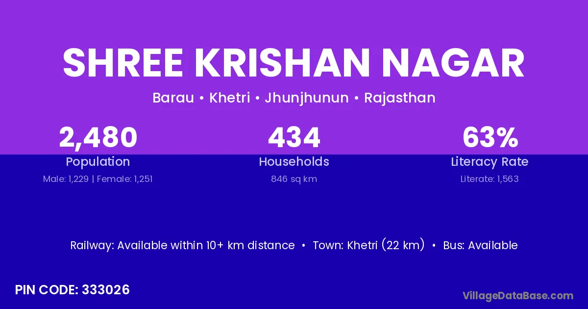 Khetri (22 km) is the nearest town to Shree Krishan Nagar village for major economic activities and is located approximately 22 km away.