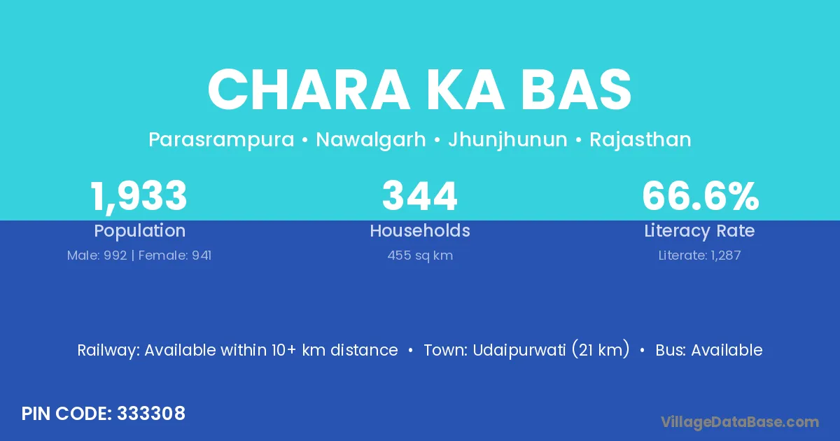 Chara Ka Bas village has a total population of 1,933 people, of which 992 are males and 941 are females.