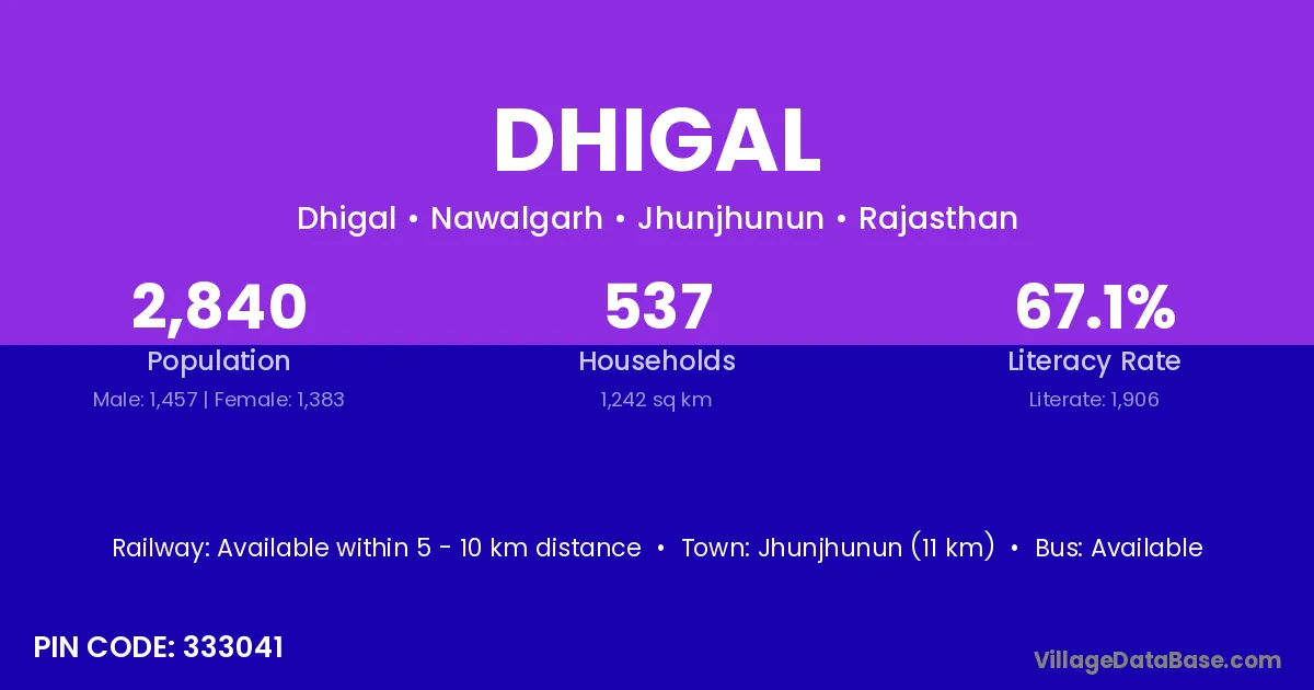 Jhunjhunun (11 km) is the nearest town to Dhigal village for major economic activities and is located approximately 11 km away.