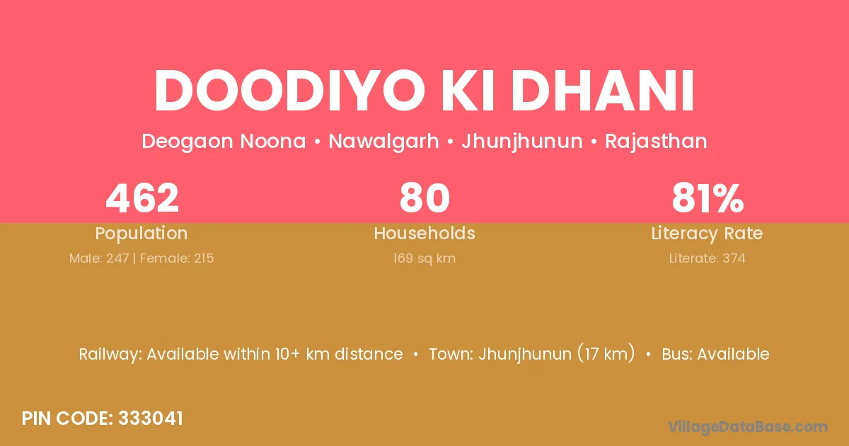 Doodiyo Ki Dhani village has a total population of 462 people, of which 247 are males and 215 are females.
