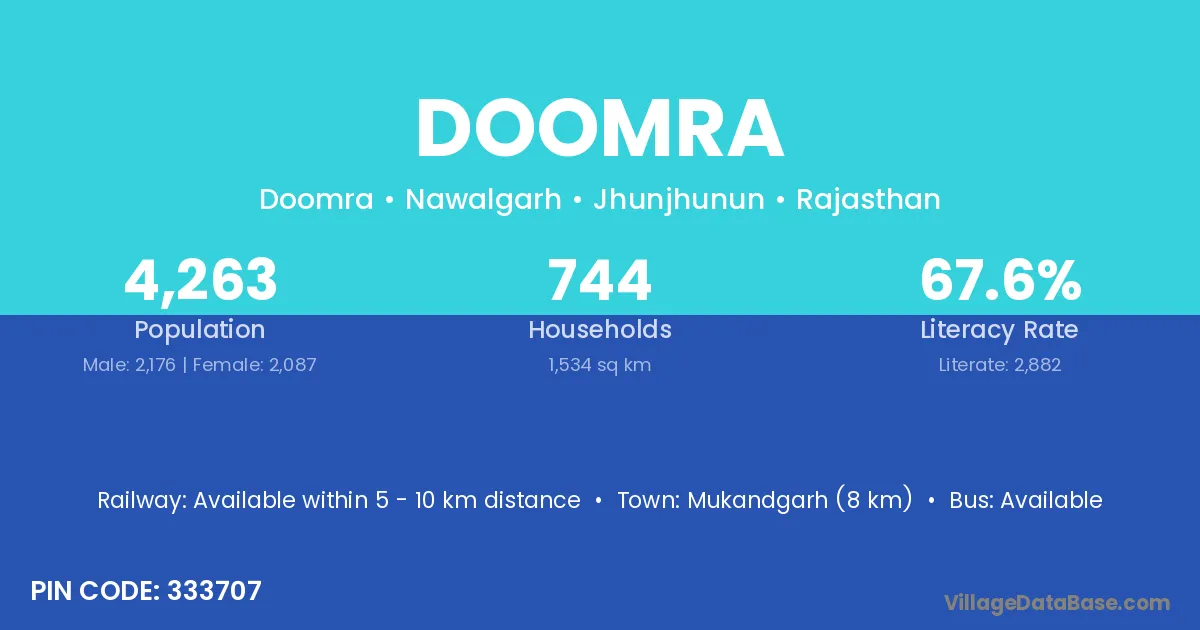 Mukandgarh (8 km) is the nearest town to Doomra village for major economic activities and is located approximately 8 km away.