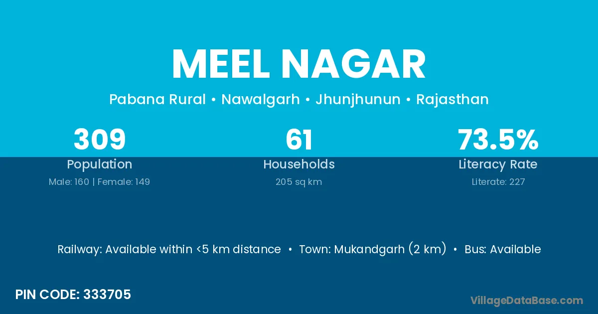 Mukandgarh (2 km) is the nearest town to Meel Nagar village for major economic activities and is located approximately 2 km away.