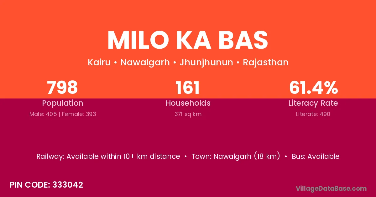 Nawalgarh (18 km) is the nearest town to Milo Ka Bas village for major economic activities and is located approximately 18 km away.