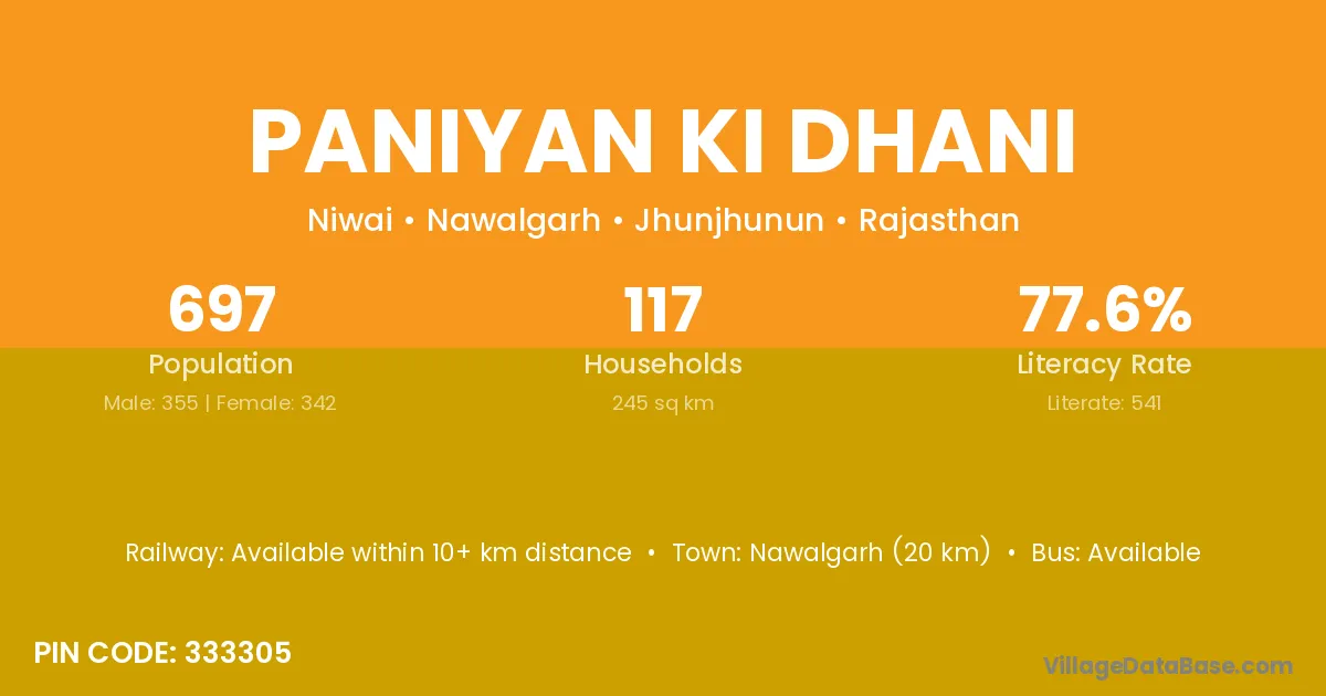 Nawalgarh (20 km) is the nearest town to Paniyan Ki Dhani village for major economic activities and is located approximately 20 km away.