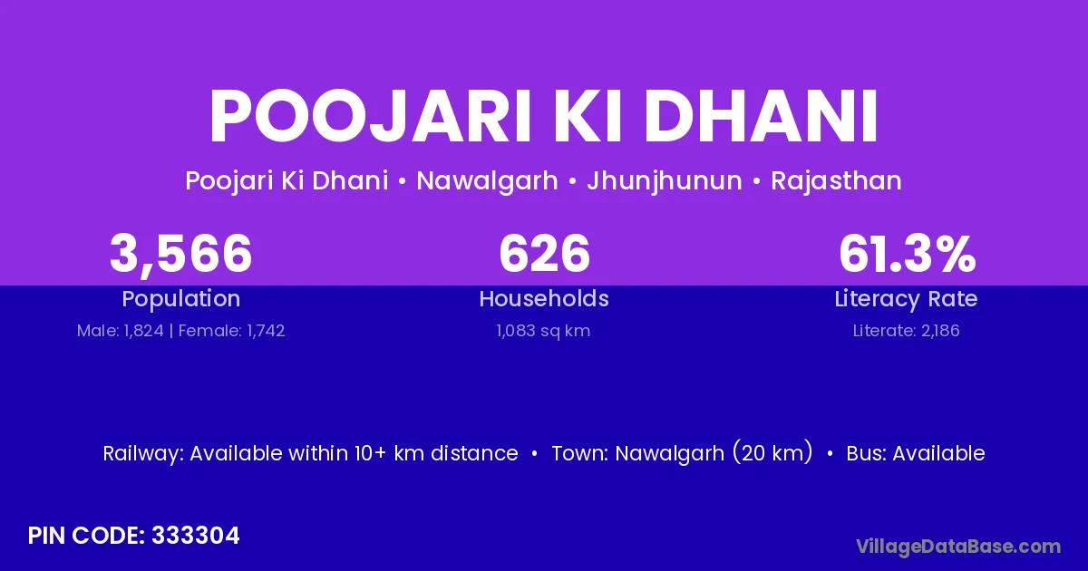 Nawalgarh (20 km) is the nearest town to Poojari Ki Dhani village for major economic activities and is located approximately 20 km away.