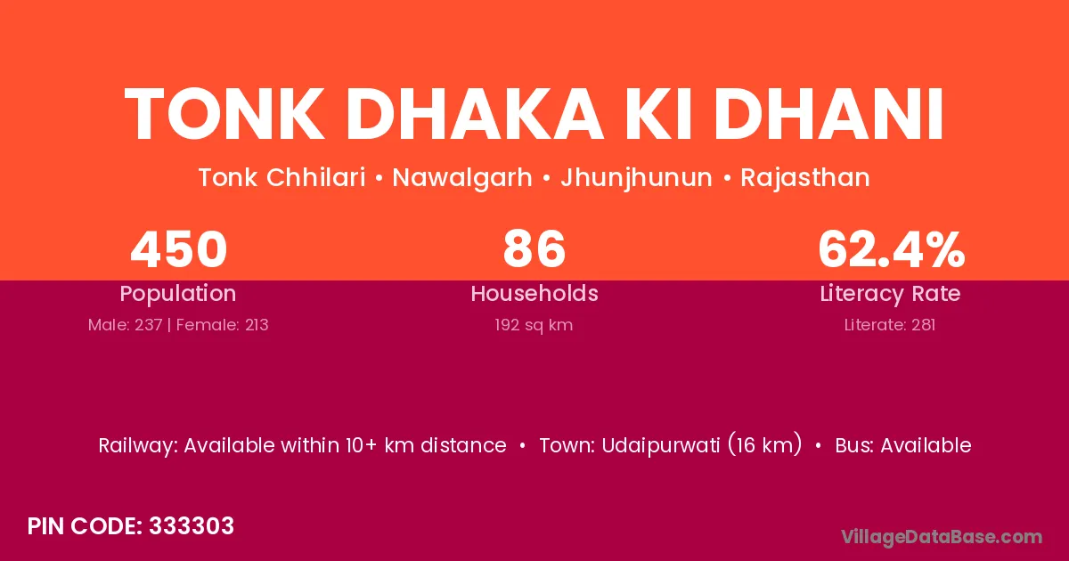 Tonk Dhaka Ki Dhani village has a total population of 450 people, of which 237 are males and 213 are females.